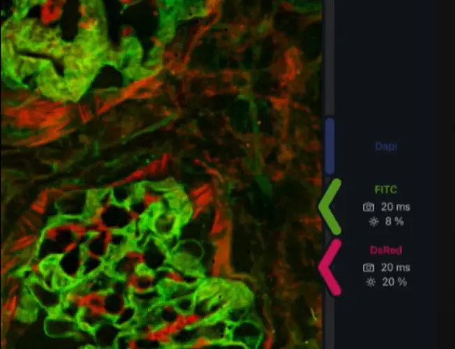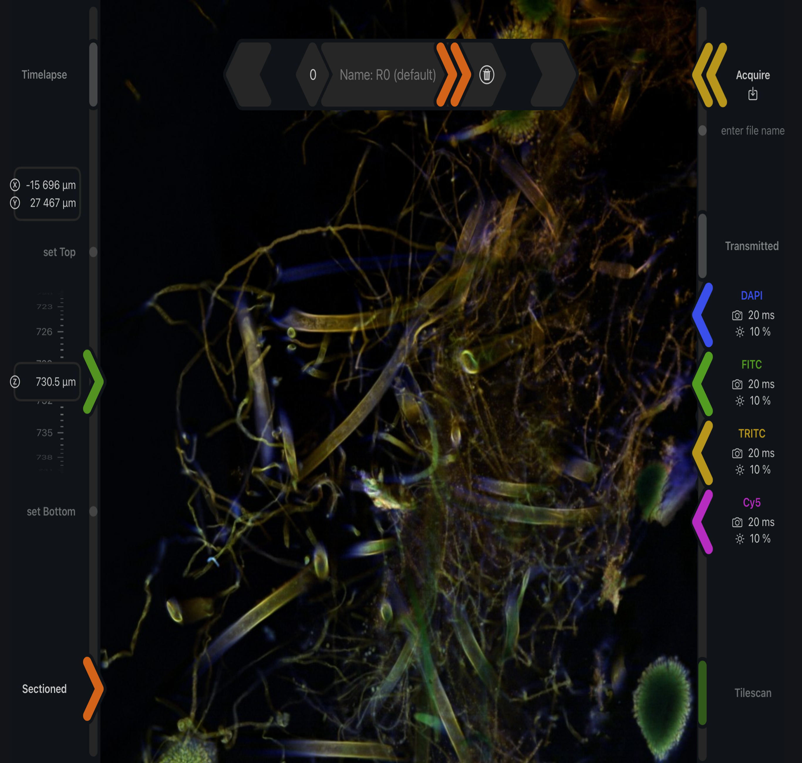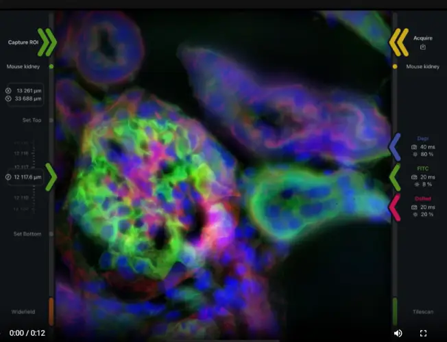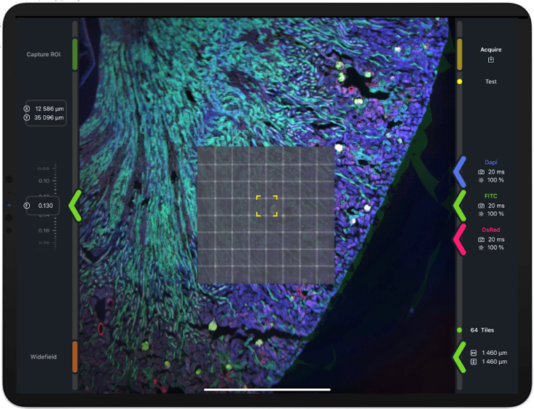 Unity uses the camera to record both confocal and widefield images in both the low magnification sample overview mode (large field of view of 4mm x 4mm) and also in the high magnification 4-100x mode for the imaging of high resolution Z-stacks.