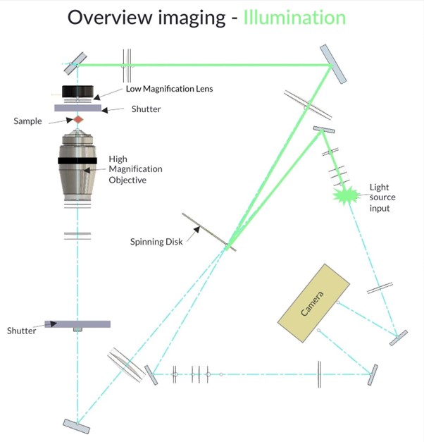 The patented optical path is central to the design of Unity and its enabling technology. It allows sample imaging from both above and below the sample, providing confocal and widefield imaging whilst maintaining an extremely compact size.